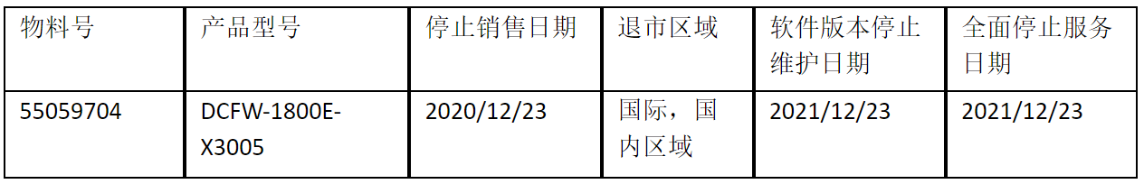 北京凯发k8官网数码云科信息技术有限公司正式通知您, 以上DCFW-1800E-X3005下一代防火墙(55059704)将于2020年12月23号停止接收新的订单(具体日期见上表),不再供货。给您带来的不便,敬请原谅。