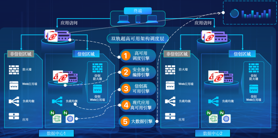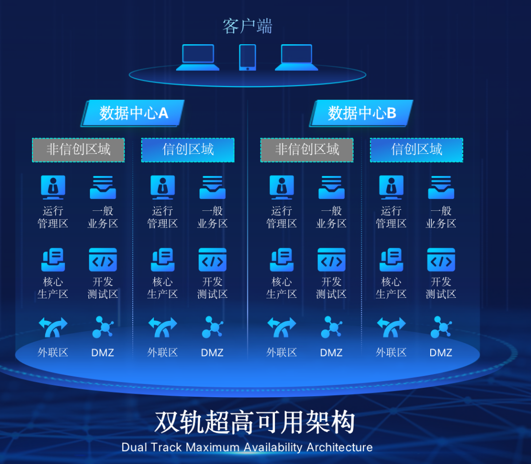 凯发k8官网在企业面临自主创新IT基础重构过程中,推出的全新架构双轨超高可用架构(简称DTMAA),在双活数据中心的分区调度基础上,添加每个数据中心内信创域和非信创域的分域调度,来实现分区分域协同的多活双轨超高可用。