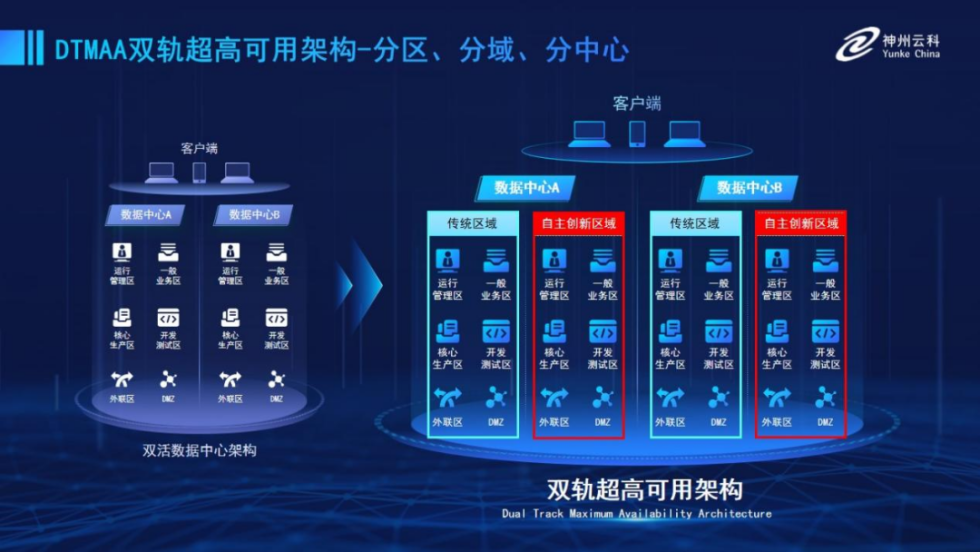 为帮助金融客户更好地应对数字经济时代对可持续性的高要求,实现“信创”与“数字化”齐头并进,凯发k8官网推出了双轨超高可用架构。该架构在双活数据中心的分区调度基础上,增加信创域和非信创域的分域调度,实行信创域与传统域应用全量部署,使双中心运营变为双中心四区域并行运行,互为多活,将“0到1”的单轨建设道路变为分区分域协同的多活双轨超高可用架构。帮助客户在新架构下,保障“信创”的同时解决性能瓶颈,提升稳定性,保证应用可持续性,最终实现信创区域和非信创区域的平滑过渡,完成国产化替代目标。